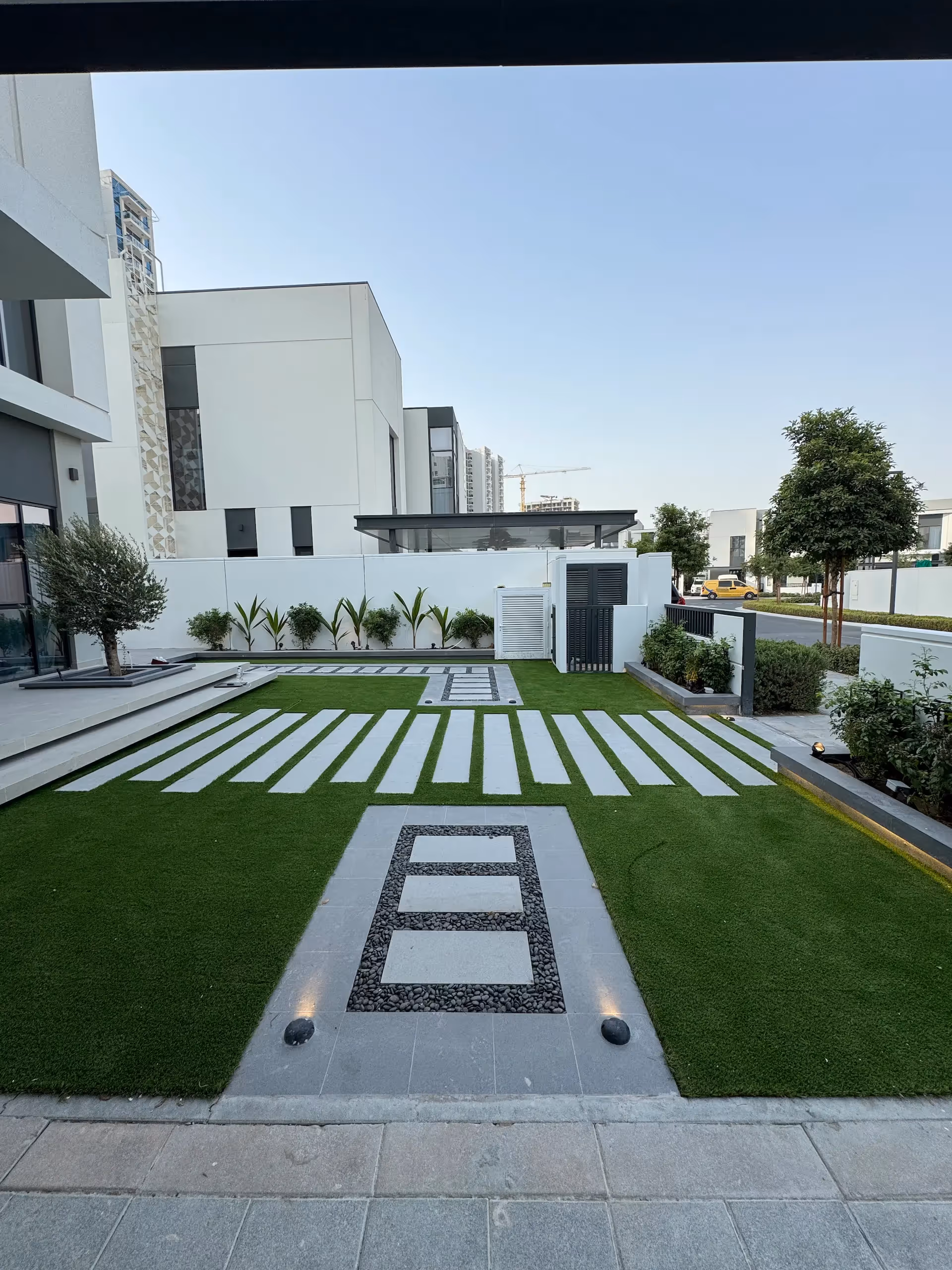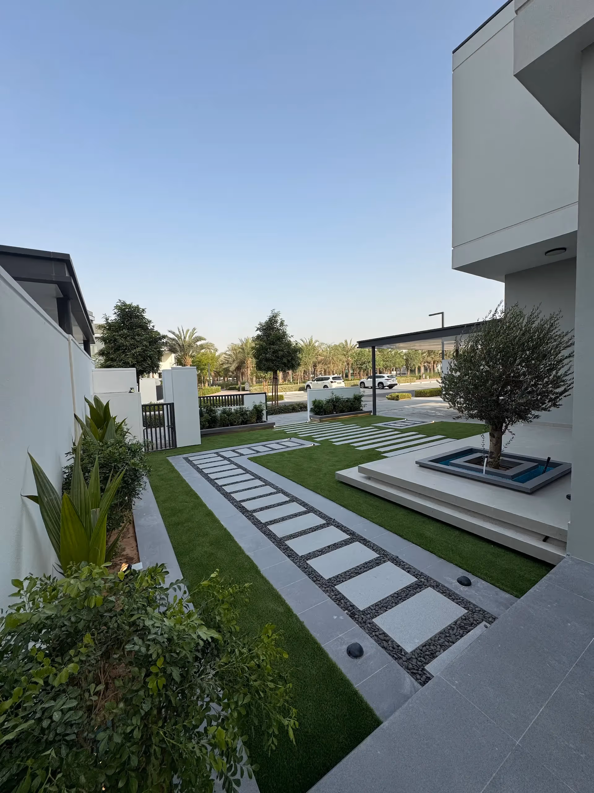 The villa’s clean architecture is complemented by landscaping that introduces warmth, greenery, and life — a private sanctuary within the city.