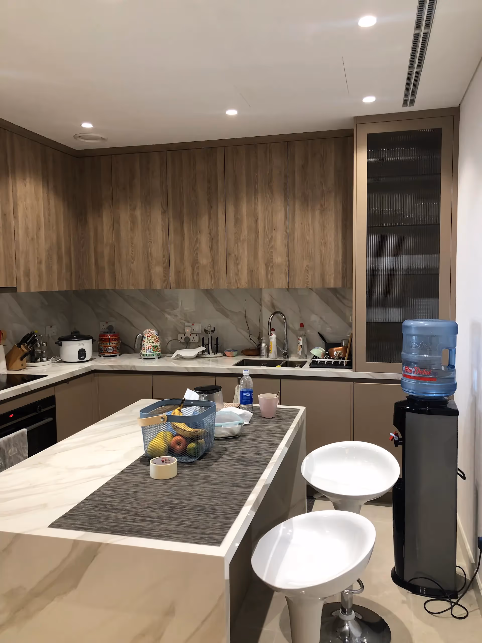 - Wood cabinetry and marble finishes creating warmth