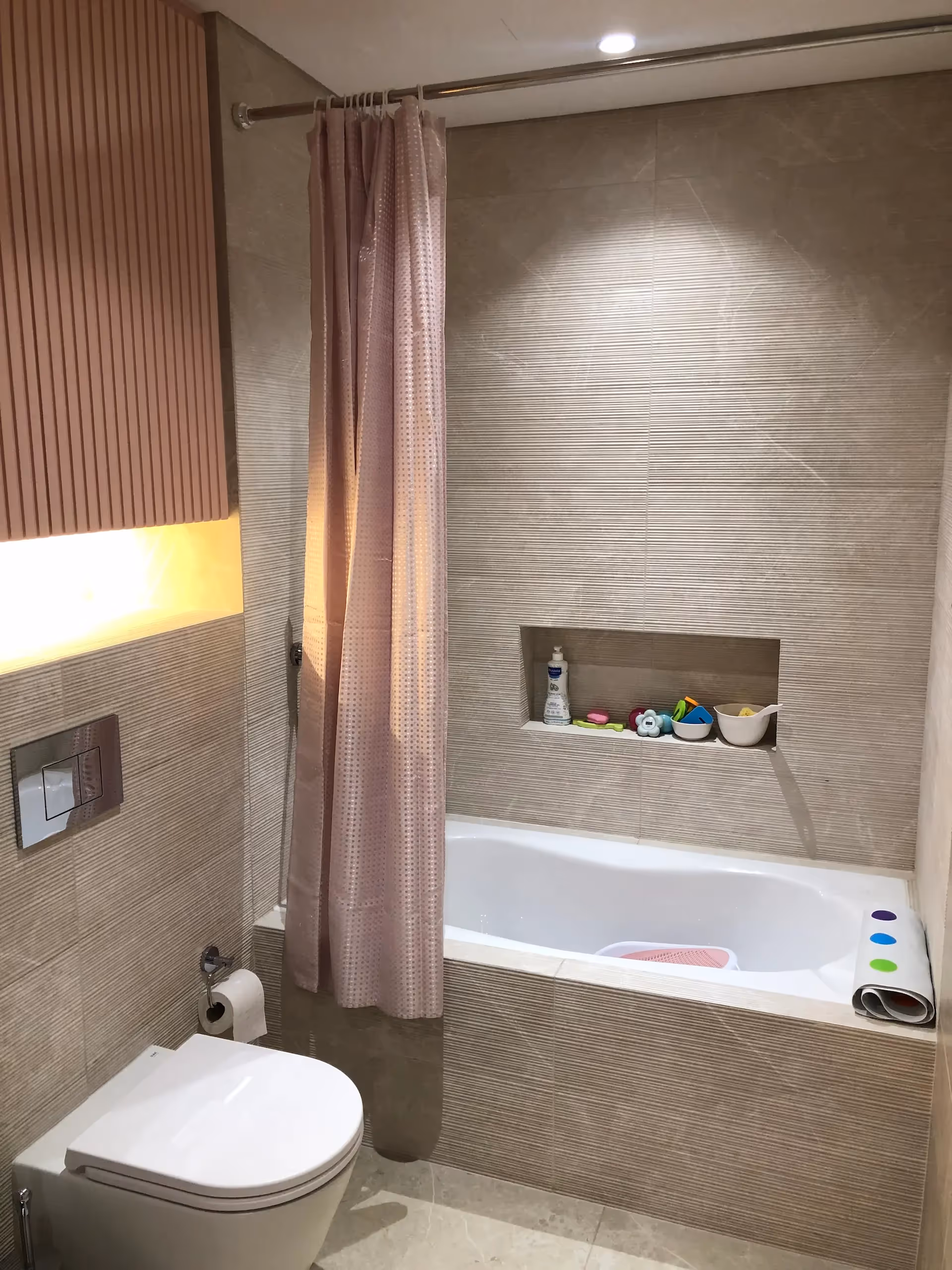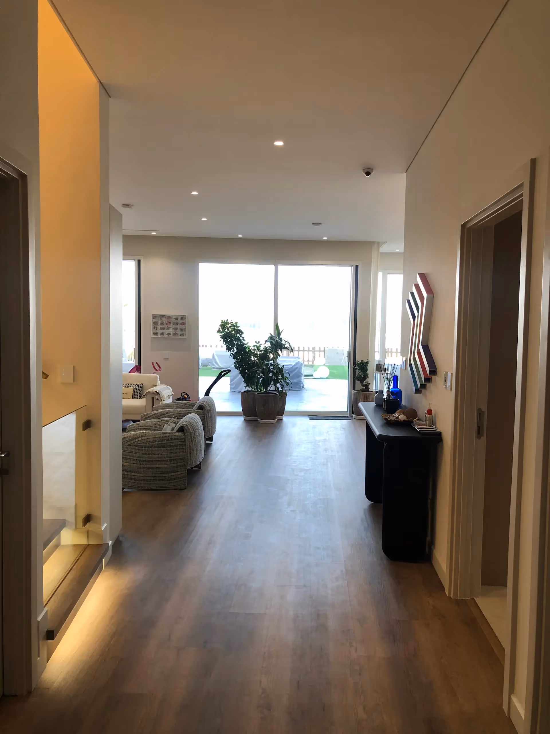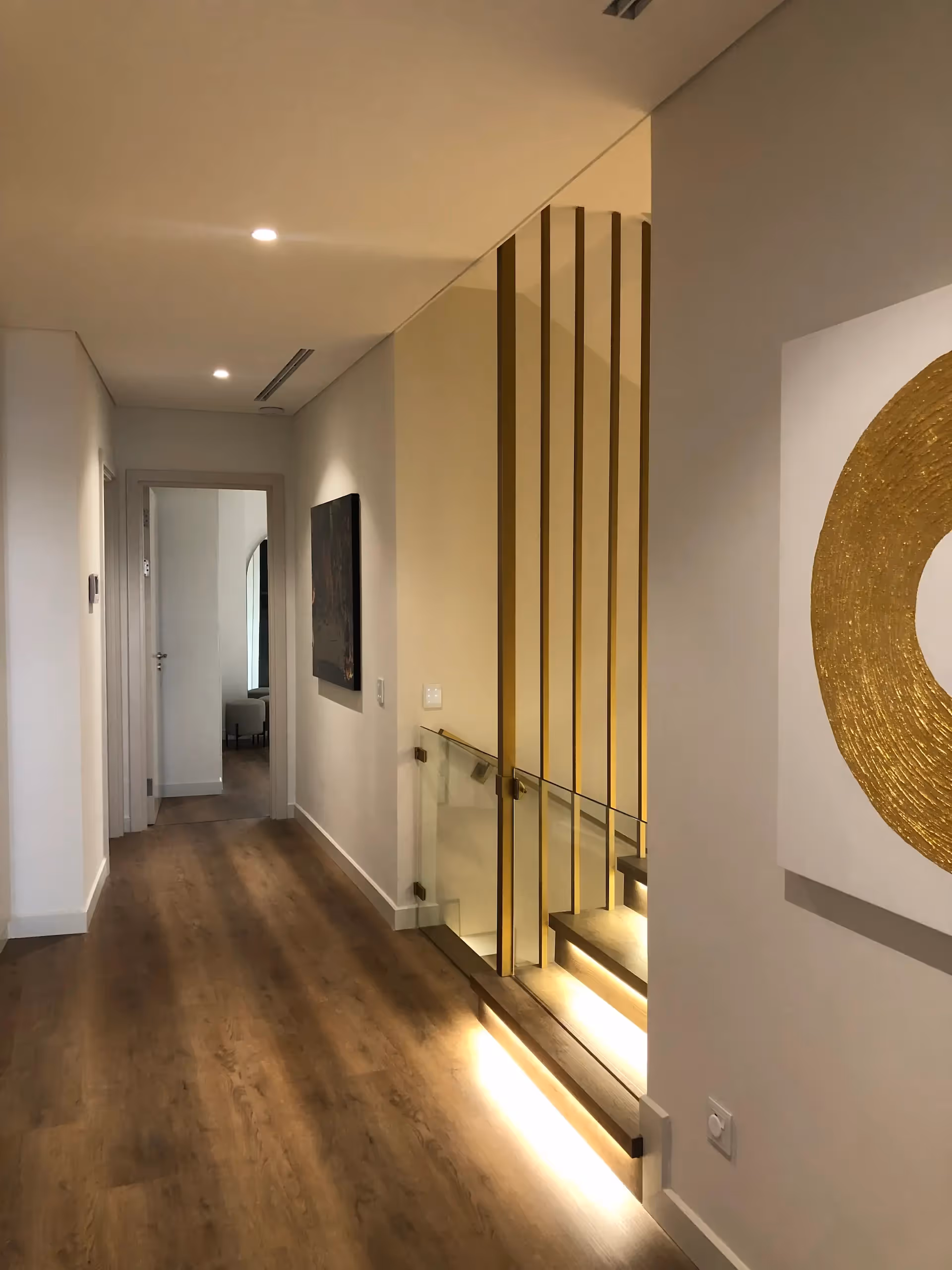 - Warm wood flooring with under-step LED accents