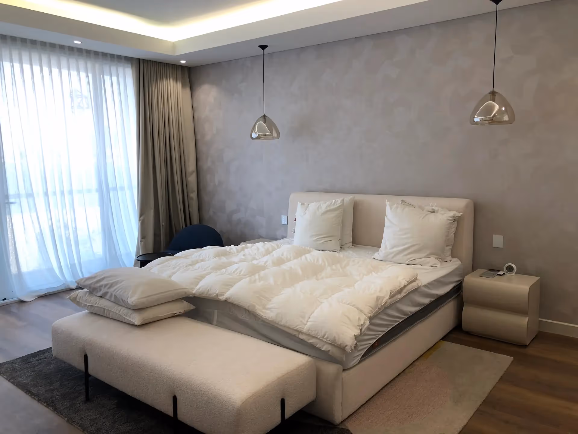 - Calm, textured master suite in soft beige tones